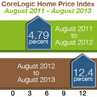 Research firm CoreLogic reported that its Home Price Index showed a year-over-year increase of 12.4 percent from August 2012 to August 2013. That marks the eighteenth consecutive month of year-over-year gains.