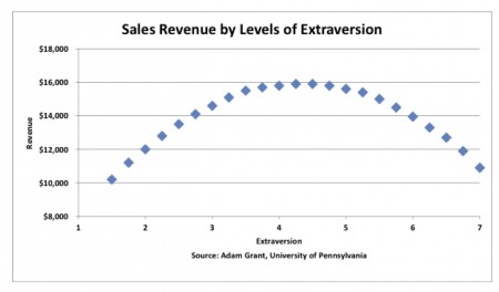 This summer Adam Grant, the youngest tenured professor at the Wharton School of the University of Pennsylvania, conducted a study that explodes the myth of the extraverted sales star. He examined a software company with a large sales staff, assessed where each salesperson stood on a 1 to 7 introversion/extraversion scale, and then charted how much they sold over the next three months.
